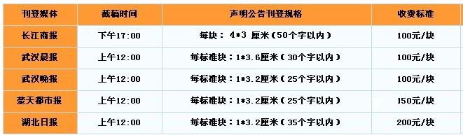 《长江商报》收费标准;按照字数收费 50个字内100元,超过50个字80个字内200元18991106978    18991107582