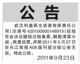 《公告登报》撤销注销备案 解除清算小组 恢复公司经营状态登报公告格式