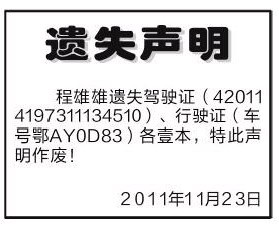 此声明刊登在长江商报2011年11月23日A15版    (以上内容登报费用100元)