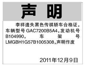 (车辆合格证遗失声明登报)湖北省车辆合格证丢失遗失声明登报格式
