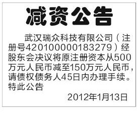 (减资公告登报模板)减资公告登报200块 先登报 再付款 减资公告怎么登报 公司减资登报公告模板 武汉瑞众科技有限公司减资公告登报