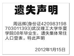 (集体户口登报)托管在湖北省人才中心的集体常住人口登记表丢失补办登报声明模板