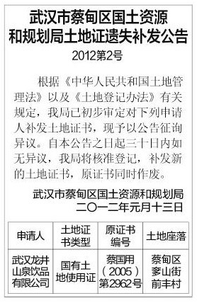 (武汉市蔡甸区国土资源和规划局土地证遗失补发公告)土地证遗失补发公告登报模板 武汉市土地证丢失登报公告 国土局公告登报 武汉市国土资源和规划土地证遗失公告