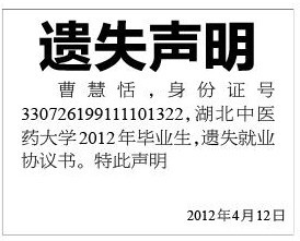 曹慧恬,身份证号330726199111101322,湖北中医药大学2012年毕业生,遗失就业协议书。特此声明