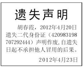 胡春霞-身份证遗失(登报声明挂失)