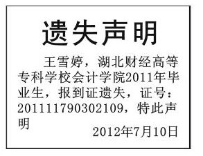 站内公告 ·《大学毕业生就业协议书登报格式》 ·湖北日报遗失声明挂失公告登报联系电话 ·报到证遗失声明登报(江汉大学) ·武汉遗失声明登报 营业执照遗失 组织机构代码证遗失 公章遗失 财务章遗失等等 ·身份证丢失登报最低价(武汉)