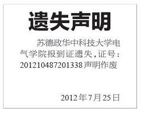 (华中科技大学毕业生报到证补办登报)报到证遗失声明登报