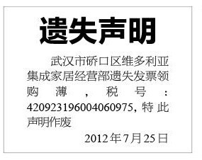 (武汉发票购领簿遗失声明登报)100元 先登报 再付款 遗失声明登报 发票领购簿遗失声明登报