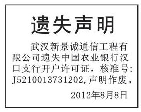 (开户许可证遗失声明)100元登报费用 先登报 再付款 银行开户许可证遗失声明 开户许可证丢失声明 挂失开户许可证怎么登报 遗失声明怎么写 开户许可证丢了怎么补办