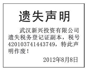 (税务登记证遗失声明登报 挂失税务登记证登报)100元 先登报 再付款 武汉市税务登记证遗失怎么办理登报 税务登记证丢失登报怎么办理 遗失声明登报怎么写