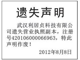 (营业执照副本挂失登报)100块 先登报 再付款 工商局认可 武汉市遗失声明登报 挂失登报 遗失声明登报 公司营业执照副本挂失登报 丢失营业执照副本登报怎么写 挂失执照登报格式