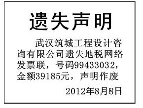 (发票遗失声明登报)100元 先登报 再付款 武汉市挂失发票登报 遗失声明登报 发票丢失登报 作废发票登报怎么办理 怎么 办理发票丢失声明